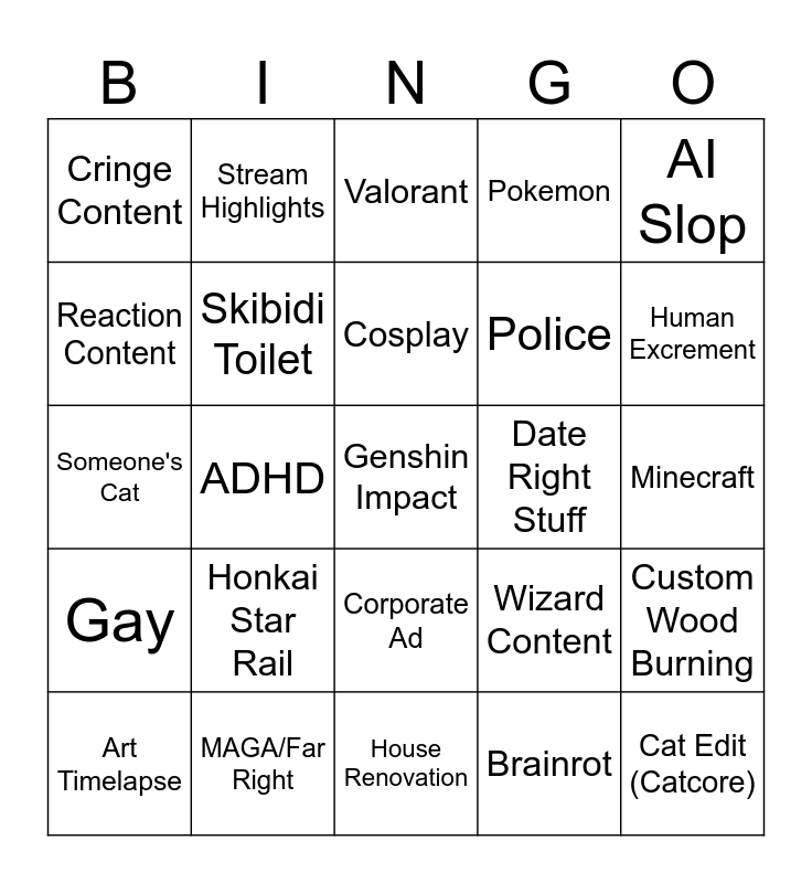 This bingo card has a free space and 43 words: Cat Edit (Phonk), Cat Edit (Catcore), Schizo Post, Art Timelapse, Actually Funny Video, Brainrot, Valorant, AOMAG Magnets, AI Slop, MAGA/Far Right, Pokemon, Date Right Stuff, Corporate Ad, Honkai Star Rail, Dhar Mann Content, House Renovation, Reddit Storytime, Someone's Cat, Less than 100 likes, Human Excrement, Stream Highlights, Roblox, Factory Content, Cringe Content, Cat That Is Ace, Minecraft, Scrump, Chloelongname, Wizard Content, Gay, Show Highlight, Custom Wood Burning, Autism, ADHD, Hydraulic Press, Heated Metal, Glass Breaking, Cosplay, Reaction Content, Police, Hopecore, Skibidi Toilet and Cat Edit (Phonk), Cat Edit (Catcore), Schizo Post, Art Timelapse, Actually Funny Video, Brainrot, Valorant, AOMAG Magnets, AI Slop, MAGA/Far Right, Pokemon, Date Right Stuff, Corporate Ad, Honkai Star Rail, Dhar Mann Content, House Renovation, Re.