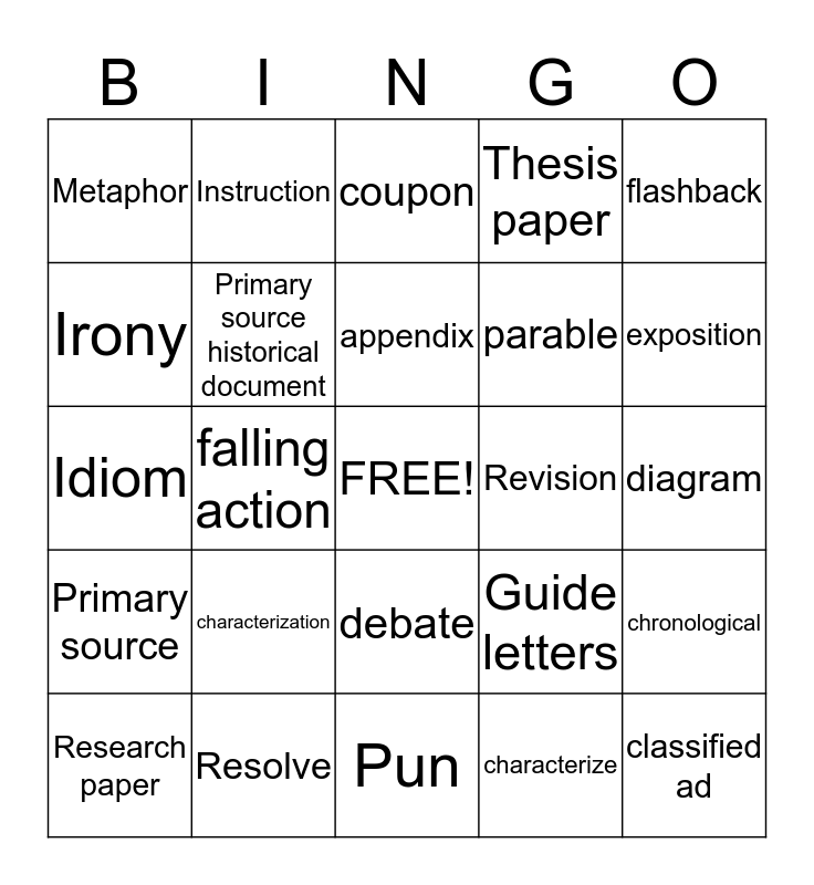 This bingo card has a free space and 42 words: allusion, appendix, cause, characterization, characterize, chronological, classified ad, connotation, coupon, debate, diagram, exposition, falling action, flashback, foreshadowing, Guide letters, Headline hyperbole, Idiom, Imagery, Instruction, Irony, Memo, Memorandum, Metaphor, narrate, onomatopoeia, parable, persuasive, picture book, Prediction, Present tense, Primary source, Primary source historical document, Pun, Quote, Research paper, Resolve, Revision, Subject, Suspense, Thesis paper and Word play.