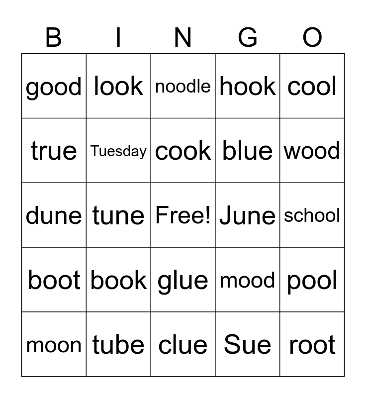 This bingo card has a free space and 24 words: book, tube, cook, moon, cool, good, true, look, June, glue, blue, dune, mood, pool, Tuesday, Sue, school, noodle, wood, tune, root, boot, hook and clue.