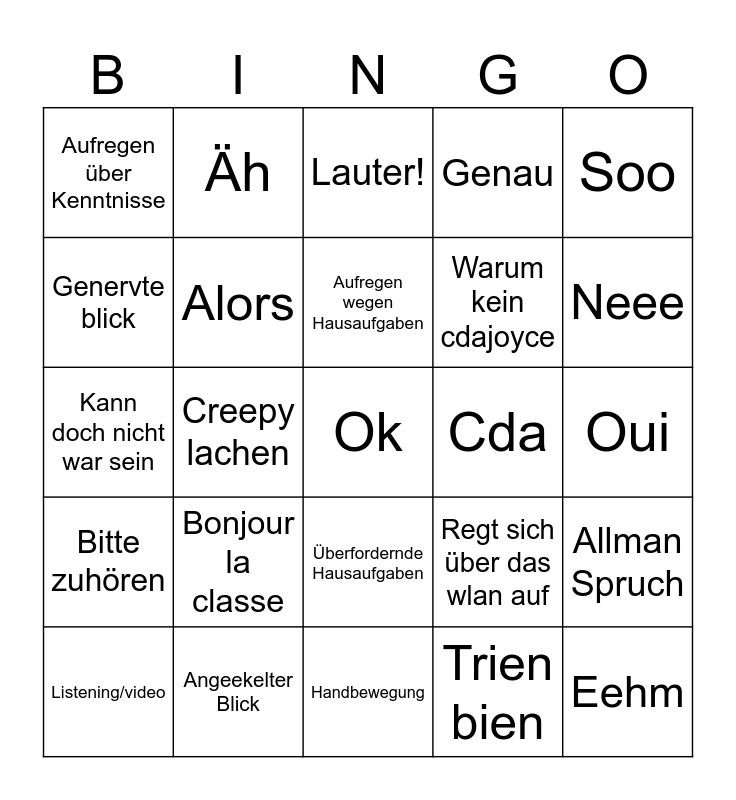 This bingo card has a free space and 24 words: Bonjour la classe, Angeekelter Blick, Aufregen wegen Hausaufgaben, Listening/video, Soo, Aufregen über Kenntnisse, Genervte blick, Äh, Cda, Überfordernde Hausaufgaben, Warum kein cdajoyce, Kann doch nicht war sein, Regt sich über das wlan auf, Allman Spruch, Alors, Trien bien, Oui, Lauter!, Neee, Creepy lachen, Eehm, Bitte zuhören, Genau and Handbewegung.