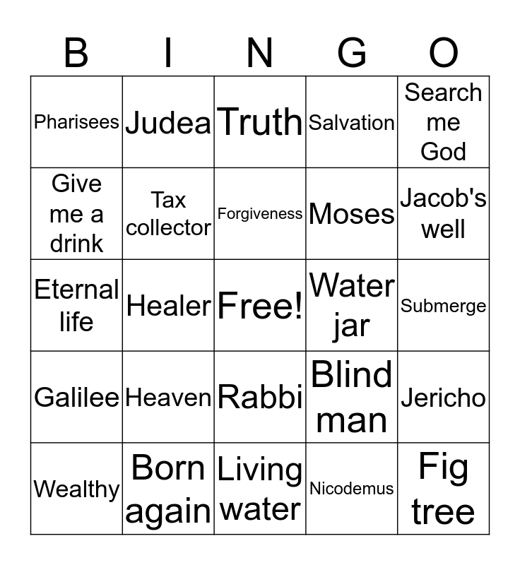 This bingo card has a free space and 24 words: Heaven, Born again, Forgiveness, Wealthy, Search me God, Pharisees, Give me a drink, Judea, Water jar, Rabbi, Moses, Eternal life, Blind man, Jericho, Tax collector, Nicodemus, Submerge, Truth, Jacob's well, Healer, Fig tree, Galilee, Salvation and Living water.