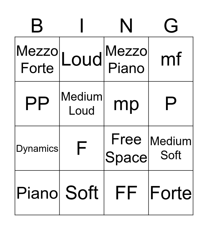 This bingo card has a free space and 15 words: Piano, Forte, Mezzo Piano, Mezzo Forte, P, PP, F, FF, Medium Loud, Dynamics, Medium Soft, mf, mp, Loud and Soft.