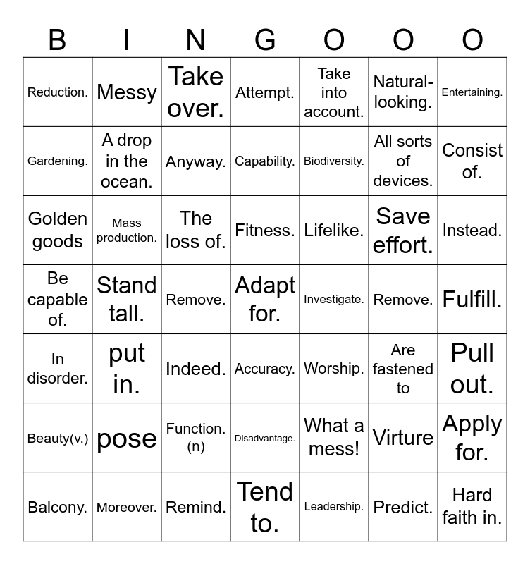 This bingo card has 68 words: Precise., All sorts of devices., Mass production., Accuracy., In disorder., unscheduled., Messy, What a mess!, Gardening., Leadership., Fitness., Balcony., Golden goods, Take into account., Attach., Natural- looking., Biodiversity., Reduction., Decrease., The loss of., A drop in the ocean., Lifelike., Mass production., Adapt for., Compete with., pose, Pull out., Beauty(v.), Save effort., Disadvantage., Take over., Apply for., Service., Serve as, Attempt., Indeed., Moreover., Instead., Anyway., Capability., Investigate., Function.(n), Entertaining., Realized one's dream., Predict., Remind., Are fastened to, Worship., Consist of., Be capable of., Fulfill., Expect to do., Hard faith in., Stand tall., Get over., Strange., Remove., Believe in., Fill in, put in., Virture, Courage., Be aware of., Affect., Forgive., Tend to., Remove. and Be charged a fine.