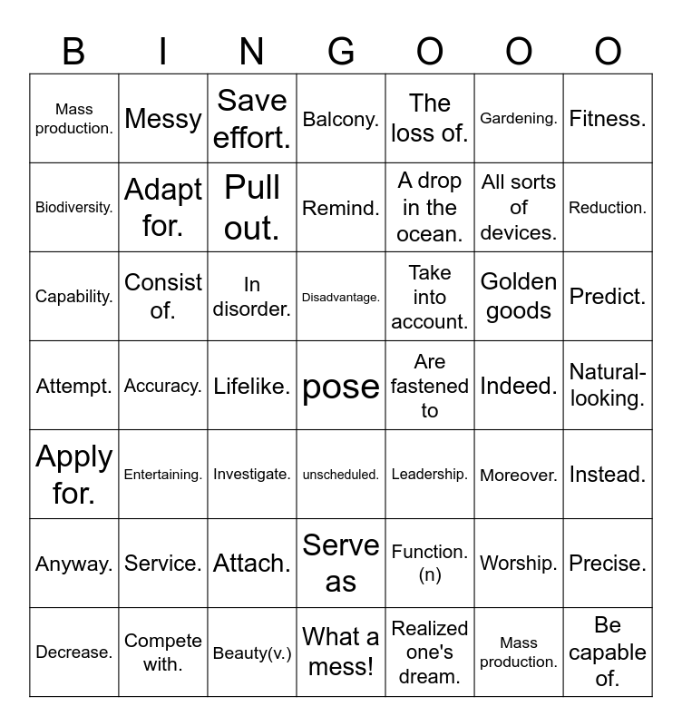 This bingo card has 50 words: Precise., All sorts of devices., Mass production., Accuracy., In disorder., unscheduled., Messy, What a mess!, Gardening., Leadership., Fitness., Balcony., Golden goods, Take into account., Attach., Natural- looking., Biodiversity., Reduction., Decrease., The loss of., A drop in the ocean., Lifelike., Mass production., Adapt for., Compete with., pose, Pull out., Beauty(v.), Save effort., Disadvantage., Take over., Apply for., Service., Serve as, Attempt., Indeed., Moreover., Instead., Anyway., Capability., Investigate., Function.(n), Entertaining., Realized one's dream., Predict., Remind., Are fastened to, Worship., Consist of. and Be capable of..