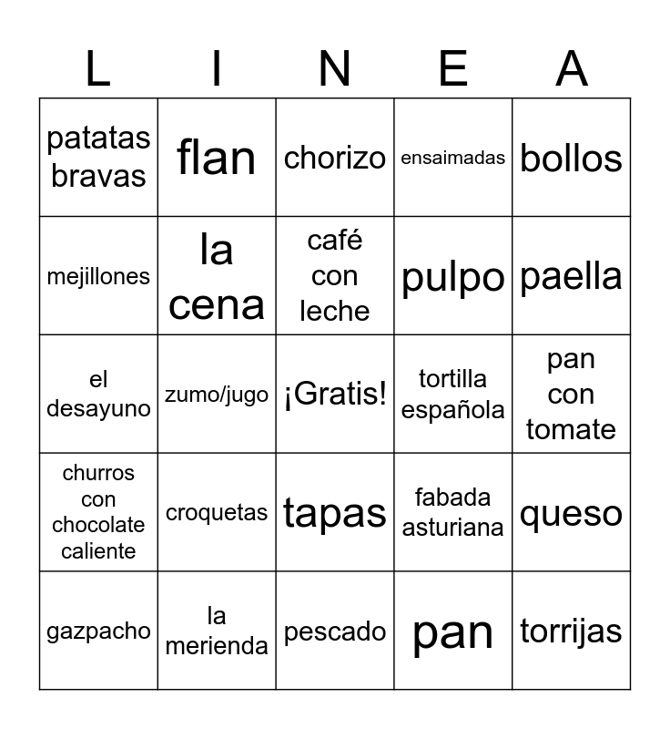 This bingo card has a free space and 40 words: la comida, el desayuno, el almuerzo, la cena, la merienda, tapas, café con leche, magdalenas, bollos, churros con chocolate caliente, zumo/jugo, ensaimadas, torrijas, pan con tomate, tortilla española, croquetas, gambas al ajillo, patatas bravas, jamón serrano, chorizo, queso, pan, pulpo, mejillones, siesta, estofado de ternera a la Catalana, chuletas de cerdo a la Madrilena, sofrito, bacalao, almejas en salsa verde, pollo a la riojana, gazpacho, ensalada mixta, fabada asturiana, paella, pescado, mariscos, arroz, flan and conejo.