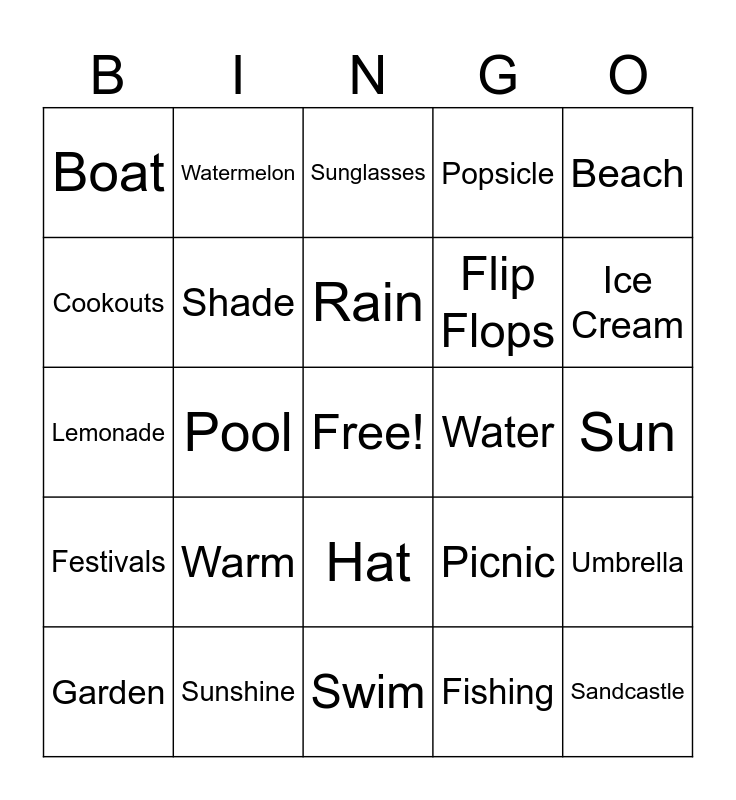 This bingo card has a free space and 24 words: Warm, Sunshine, Rain, Garden, Beach, Boat, Cookouts, Watermelon, Water, Hat, Flip Flops, Lemonade, Picnic, Umbrella, Shade, Fishing, Sun, Sunglasses, Ice Cream, Pool, Sandcastle, Festivals, Popsicle and Swim.