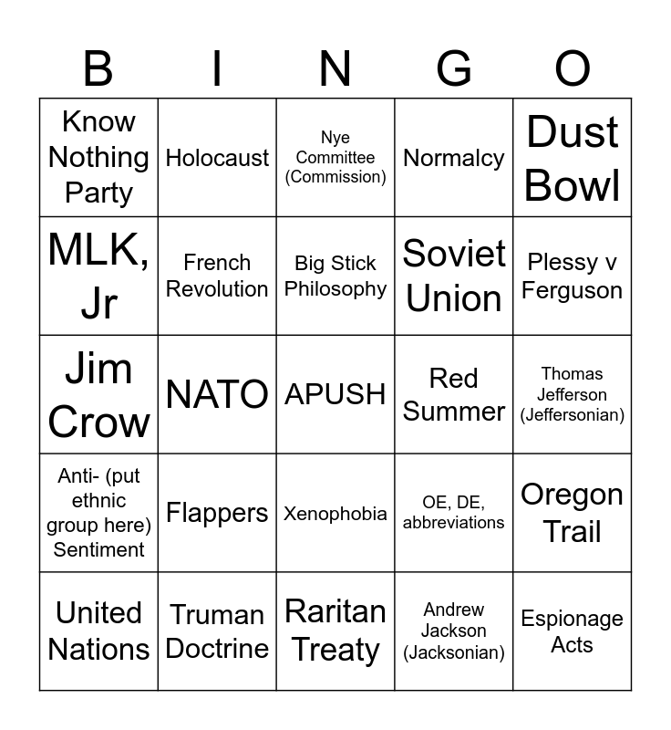 This bingo card has a free space and 24 words: Flappers, Truman Doctrine, Big Stick Philosophy, United Nations, Dust Bowl, Know Nothing Party, MLK, Jr, Holocaust, Red Summer, Xenophobia, Soviet Union, Jim Crow, OE, DE, abbreviations, Oregon Trail, French Revolution, Andrew Jackson (Jacksonian), Thomas Jefferson (Jeffersonian), Nye Committee (Commission), Plessy v Ferguson, NATO, Espionage Acts, Anti- (put ethnic group here) Sentiment, Normalcy and Raritan Treaty.