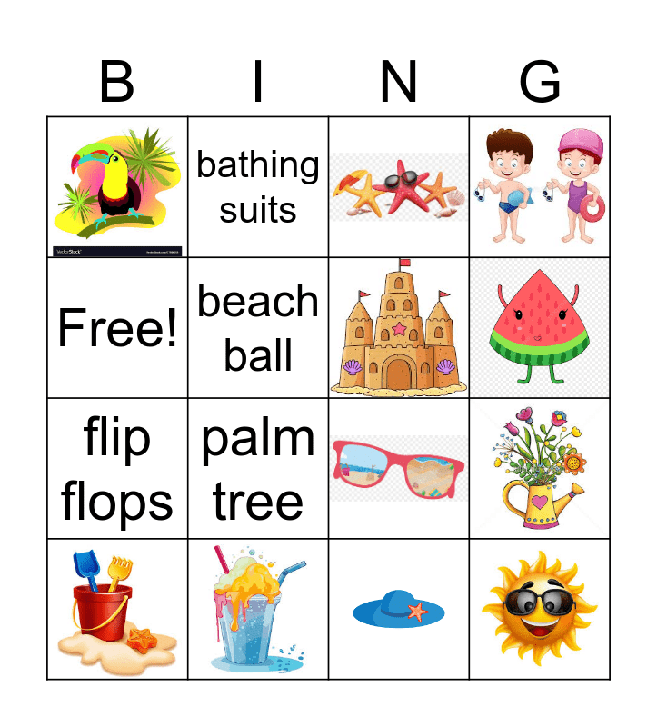 This bingo card has 20 images and 21 words: Free!, goggles, sunglasses, flip flops, sandcastle, seashells, ice cream, watermelon, palm tree, sun, flowers, bathing suits, pail and shovel, sun hat, slushy, beach ball, camera, bird, flamingo, starfish and surf board.