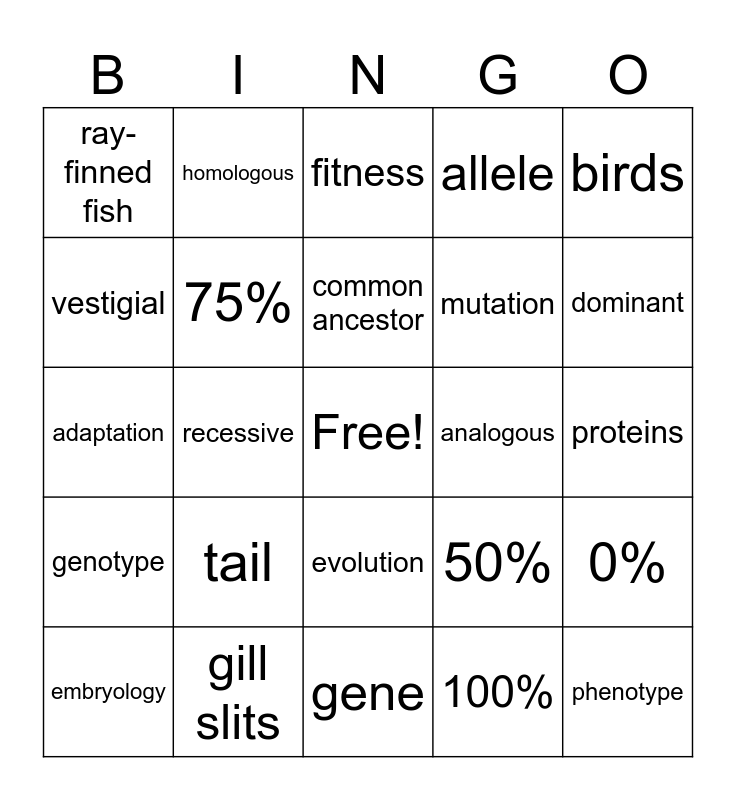 This bingo card has a free space and 24 words: tail, gill slits, common ancestor, embryology, birds, ray-finned fish, vestigial, homologous, analogous, evolution, mutation, adaptation, 50%, 0%, 75%, 100%, proteins, fitness, dominant, recessive, phenotype, genotype, allele and gene.