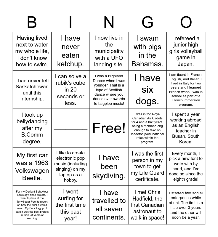 This bingo card has a free space and 27 words: I was the first person in my town to get my Life Guard certificate., ____________________, I have six dogs., I have travelled to all seven continents., I had never left Saskatchewan until this Internship., I now live in the municipality with a UFO landing site., I have never eaten ketchup., My first car was a 1963 Volkswagen Beetle., I was in the Royal Canadian Air Cadets for 4 and a half years, being a member long enough to take on leadership/educational roles within the program., Every month, I pick a new font to write with by hand, and I’ve done so since the eighth grade!, I took up bellydancing after my B.Comm degree., I swam with pigs in the Bahamas., For my Deviant Behaviour Sociology class project, I went topless at the Terwillegar Pool to report on how the public would react. My Sociology prof said it was the best project in their 23 years of teaching., I went surfing for the first time this past year!, I am fluent in French, English, and Italian; I lived in Italy for two years and I learned French when I was in school as part of a French immersion program., I hiked up the Great Wall of China and spent the night in one of its watchtowers., I can solve a rubik's cube in 20 seconds or less., I was a Highland Dancer when I was younger. That is a type of Scottish dance where you dance over swords to bagpipe music!, I like to create electronic pop music (including singing) on my laptop as a hobby., Having lived next to water my whole life, I don’t know how to swim., I spent a year working abroad as an English teacher in Busan, South Korea!, I met Chris Hadfield, the first Canadian astronaut to walk in space!, ____________________, I started two social enterprises while at uni. The first is a little over 3 years and the other will soon be a year., I have been skydiving., I refereed a junior high girls volleyball game in Japan. and I lost the final of the Canadian Curling Championship..