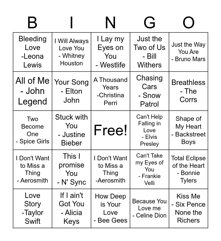 This bingo card has a free space and 24 words: This I promise You - N' Sync, If I ain't Got You - Alicia Keys, A Thousand Years -Christina Perri, Love Story -Taylor Swift, Just the Way You Are - Bruno Mars, Bleeding Love -Leona Lewis, All of Me - John Legend, I Will Always Love You - Whitney Houston, Can't Help Falling in Love - Elvis Presley, I Don't Want to Miss a Thing -Aerosmith, Chasing Cars - Snow Patrol, Two Become One - Spice Girls, Can't Take my Eyes of You - Frankie Velli, Total Eclipse of the Heart - Bonnie Tylers, Your Song - Elton John, Because You Love me - Celine Dion, Shape of My Heart - Backstreet Boys, I Lay my Eyes on You - Westlife, Breathless - The Corrs, Stuck with You - Justine Bieber, Kiss Me - Six Pence None the Richers, I Don't Want to Miss a Thing - Aerosmith, Just the Two of Us - Bill Withers and How Deep is Your Love - Bee Gees.