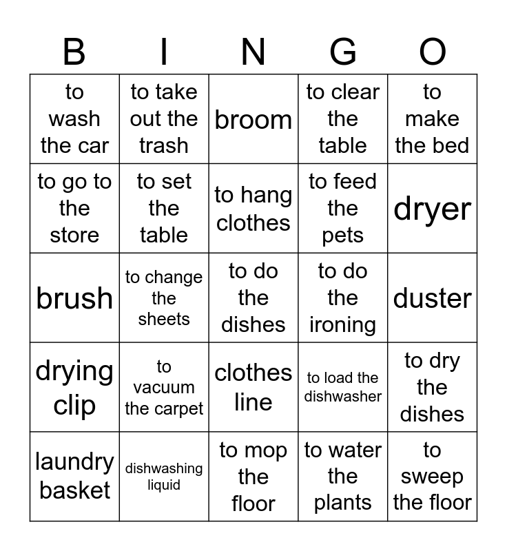 This bingo card has a free space and 49 words: to clean the windows, to sweep the floor, to scrub the floor, to mop the floor, to vacuum the carpet, to dust, to take out the trash, to clean up, to go to the store, to clean the bathroom, to set the table, to clear the table, to dry the dishes, to load the dishwasher, to unload the dishwasher, to do the laundry, to hang clothes, to do the ironing, to fold clothes, to make the bed, to change the sheets, to water the plants, to wash the car, to feed the pets, washing machine, dryer, laundry basket, laundry detergent, clothes line, drying clip, iron, ironing board, bucket, mop, dishwashing liquid, scouring pad, sponge, cloth, duster, polish, cleaning fluid, bleach, vacuum cleaner, dustpan, brush, broom, recycling bin, garbage bag and rubber gloves.