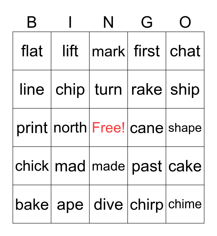This bingo card has a free space and 24 words: mad, ape, turn, bake, chat, flat, line, lift, cane, made, rake, print, past, cake, chip, chirp, shape, mark, ship, north, chime, chick, first and dive.
