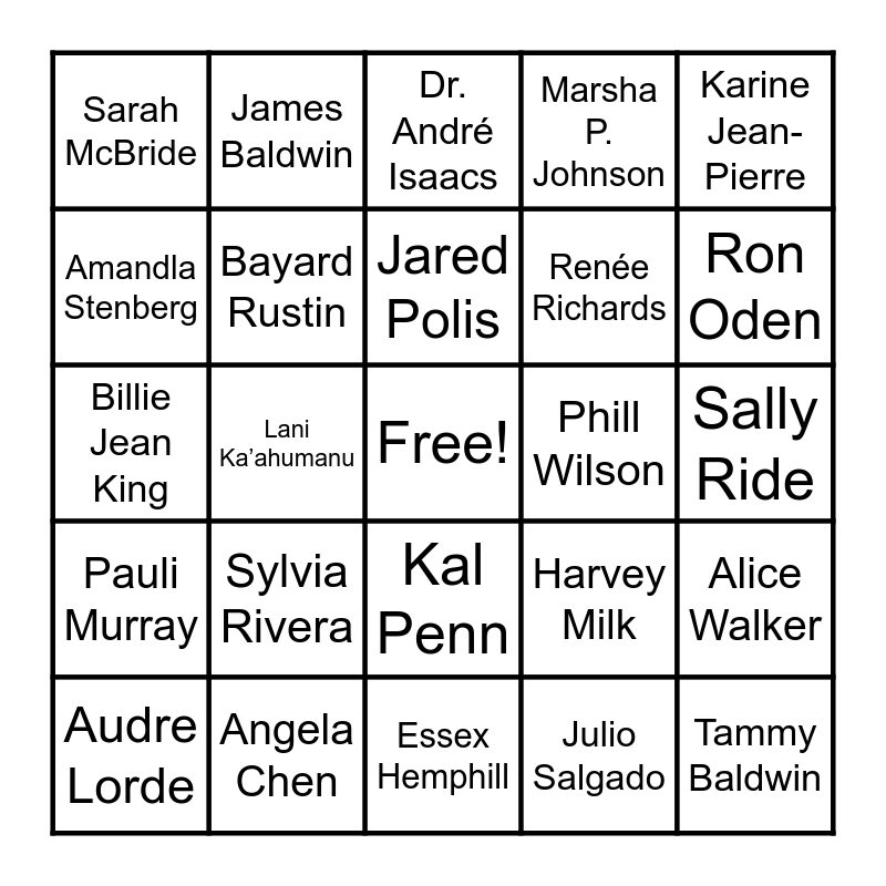 This bingo card has a free space and 36 words: Aimee Stephens, Andrea Jenkins, Barbara Gittings, Bayard Rustin, Harvey Milk, Pauli Murray, Jared Polis, Jim Obergefell, Karine Jean-Pierre, Kim Coco Iwamoto, Lani Ka’ahumanu, Marsha P. Johnson, Pete Buttigieg, Phill Wilson, Ron Oden, Sarah McBride, Stormé DeLarverie, Sylvia Rivera, Tammy Baldwin, Dr. André Isaacs, Sally Ride, Alice Walker, Angela Chen, Audre Lorde, Essex Hemphill, James Baldwin, Billie Jean King, Michael Sam, Renée Richards, Amandla Stenberg, Billy Porter, Josephine Baker, Julio Salgado, Kal Penn, Margaret Cho and RuPaul.