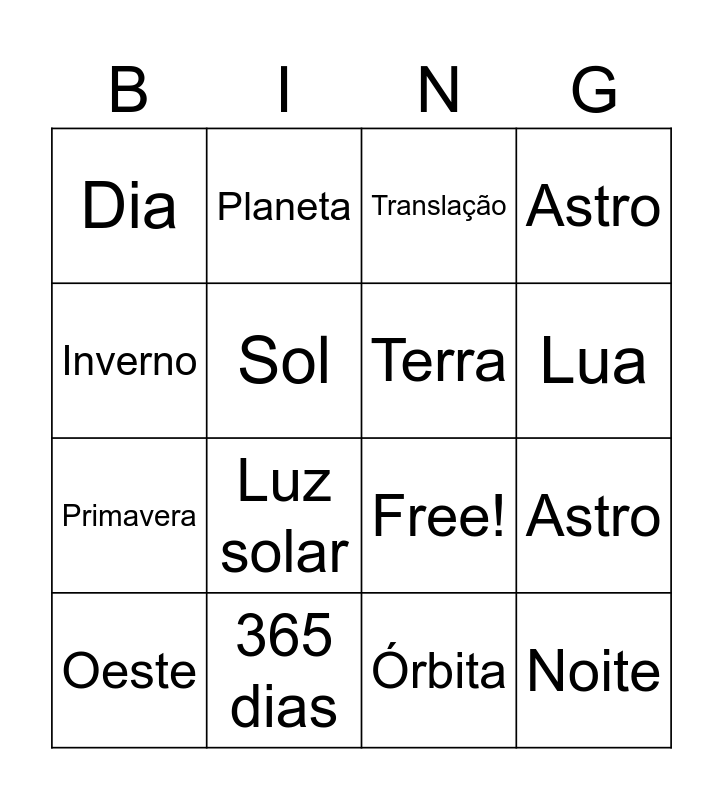 This bingo card has 16 words: 365 dias, Astro, Translação, Dia, Primavera, Planeta, Free!, Órbita, Inverno, Sol, Oeste, Astro, Luz solar, Lua, Terra and Noite.