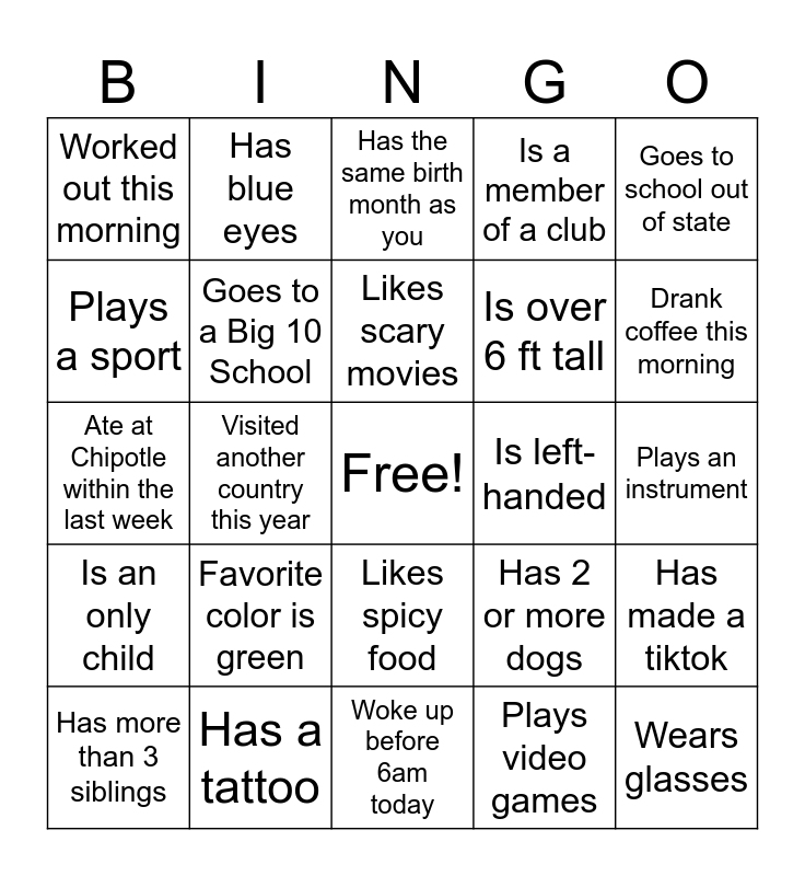 This bingo card has a free space and 29 words: Has more than 3 siblings, Never broken a bone, Visited another country this year, Flown in a helicopter, Worked out this morning, Has the same birth month as you, Goes to a Big 10 School, Favorite color is green, Is left- handed, Has a tattoo, Plays an instrument, Wears glasses, Woke up before 6am today, Plays video games, Drank coffee this morning, Speaks a second language, Likes spicy food, Is an only child, Goes to school out of state, Ate at Chipotle within the last week, Has 2 or more dogs, Lives with roommates, Is over 6 ft tall, Plays a sport, Is a member of a club, Has blue eyes, Has made a tiktok, Likes scary movies and Has a cat.