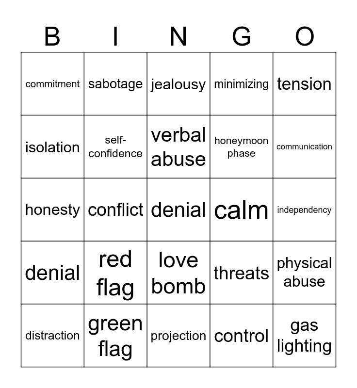 This bingo card has a free space and 24 words: red flag, green flag, verbal abuse, distraction, tension, commitment, isolation, sabotage, calm, love bomb, honeymoon phase, honesty, threats, physical abuse, self-confidence, control, independency, jealousy, communication, conflict, gas lighting, denial, minimizing and projection.