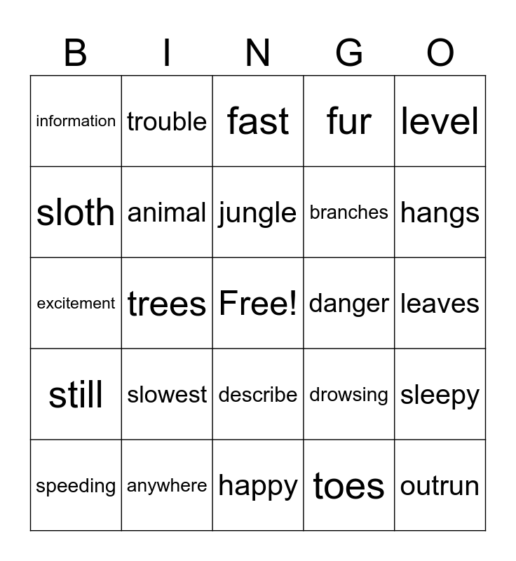 This bingo card has a free space and 24 words: slowest, anywhere, jungle, speeding, level, information, sloth, trouble, danger, describe, branches, excitement, drowsing, sleepy, animal, toes, leaves, fast, hangs, trees, outrun, still, fur and happy.
