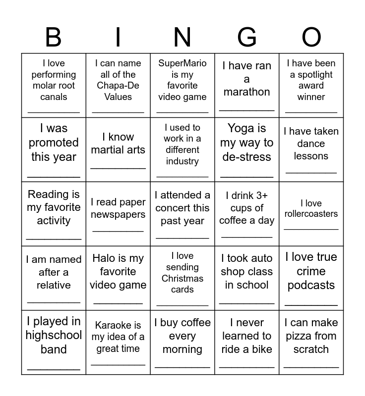 This bingo card has a free space and 24 words: Halo is my favorite video game ________, Karaoke is my idea of a great time __________, I used to work in a different industry __________, I played in highschool band ________, I have been a spotlight award winner __________, I love performing molar root canals __________, I was promoted this year ________, I can name all of the Chapa-De Values __________, I drink 3+ cups of coffee a day _________, I love sending Christmas cards __________, Yoga is my way to de-stress ________, Reading is my favorite activity _________, I took auto shop class in school _________, I love true crime podcasts ________, I know martial arts _________, I never learned to ride a bike _________, I love rollercoasters ___________, SuperMario is my favorite video game __________, I have taken dance lessons _________, I read paper newspapers _________, I can make pizza from scratch _________, I am named after a relative _________, I have ran a marathon _________ and I buy coffee every morning _________.