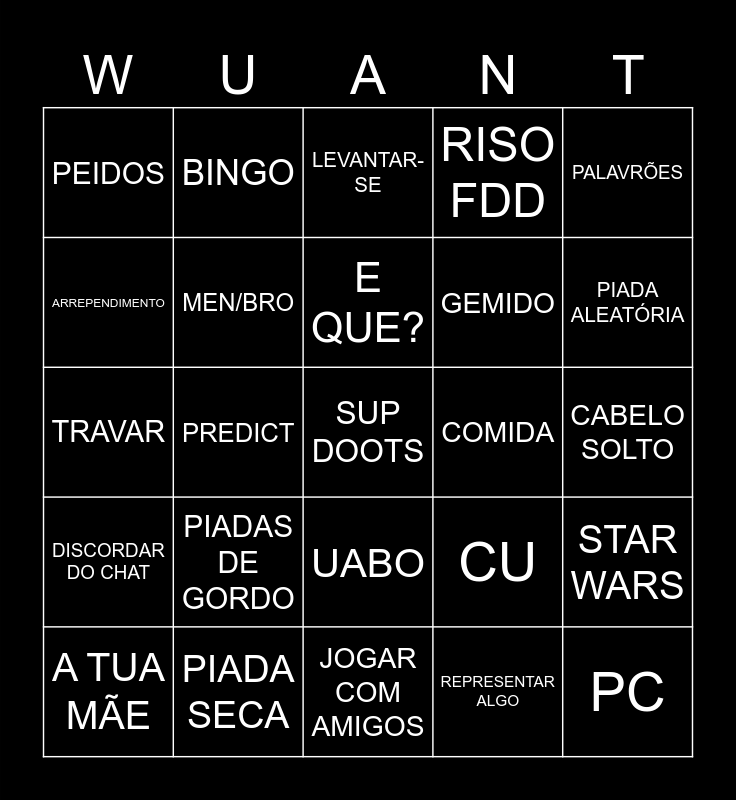 This bingo card has a free space and 39 words: LAG, WUANT, ?????, MEN/BRO, A TUA MÃE, UABO, E QUE?, CHAT, PALAVRÕES, DISCORDAR DO CHAT, PREDICT, RISO FDD, PC, CABELO SOLTO, COMIDA, PIADAS DE GORDO, BIPOLAR, PEIDOS, "PEGA", CU, ARREPENDIMENTO, JOGAR COM AMIGOS, GEMIDO, PIADA ALEATÓRIA, RISO DE MORTE, VOZINHAS, RAGE, WINDOH, COPYRIGHT, BINGO, BATER EM COISAS, AJEITAR-SE, LEVANTAR-SE, PIADA SECA, REPRESENTAR ALGO, ARROTAR, STAR WARS, TRAVAR and MICRO FDD.