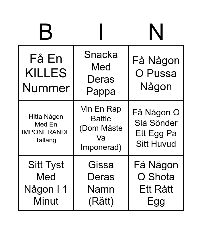 This bingo card has a free space and 8 words: Få Någon O Slå Sönder Ett Egg På Sitt Huvud, Få Någon O Pussa Någon, Snacka Med Deras Pappa, Sitt Tyst Med Någon I 1 Minut, Få En KILLES Nummer, Få Någon O Shota Ett Rått Egg, Hitta Någon Med En IMPONERANDE Tallang and Gissa Deras Namn (Rätt).