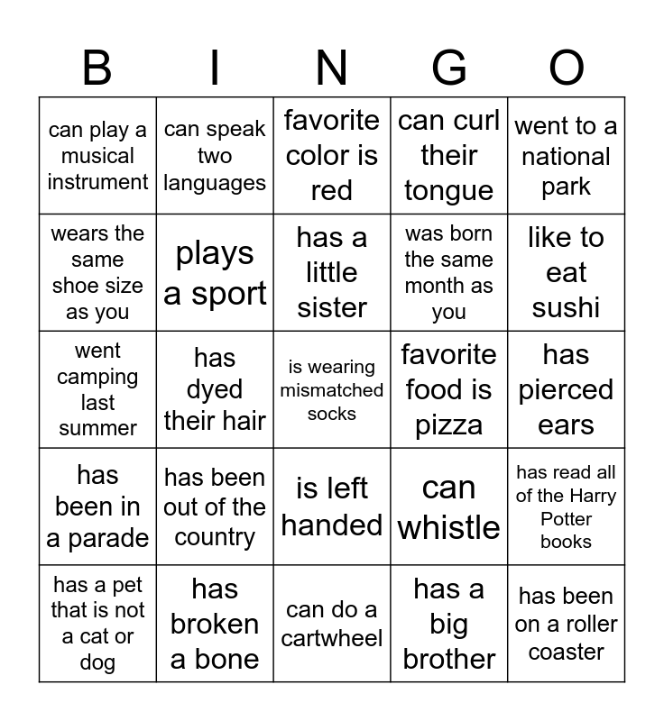 This bingo card has a free space and 24 words: has been out of the country, has broken a bone, has a little sister, has a pet that is not a cat or dog, went to a national park, can play a musical instrument, wears the same shoe size as you, can speak two languages, favorite food is pizza, is left handed, was born the same month as you, went camping last summer, can whistle, has read all of the Harry Potter books, plays a sport, has a big brother, has pierced ears, favorite color is red, like to eat sushi, has dyed their hair, has been on a roller coaster, has been in a parade, can curl their tongue and can do a cartwheel.