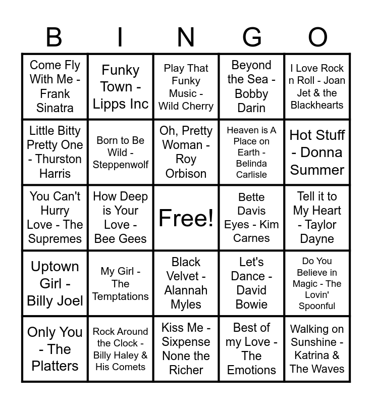This bingo card has a free space and 54 words: Dancing Queen - ABBA, Uptown Girl - Billy Joel, Step By Step - New Kids on the Block, All Around the World - Lisa Stansfield, Black Velvet - Alannah Myles, Vogue - Madonna, Beyond the Sea - Bobby Darin, Heartbreak Hotel - Elvis Presley, Little Bitty Pretty One - Thurston Harris, Dream Lover - Bobby Darin, Come Fly With Me - Frank Sinatra, Lollipop - The Chordettes, Rock Around the Clock - Billy Haley & His Comets, Only You - The Platters, Take Five - Dave Burbeck, Kiss Me - Sixpense None the Richer, Walking on Sunshine - Katrina & The Waves, Heaven is A Place on Earth - Belinda Carlisle, Should I Stay or Should I Go - The Clash, Tell it to My Heart - Taylor Dayne, Let's Dance - David Bowie, Kiss - Prince, Bette Davis Eyes - Kim Carnes, I Love Rock n Roll - Joan Jet & the Blackhearts, Holiday - Madonna, Funky Town - Lipps Inc, Sara Smile - Daryl Hall & John Oates, Reasons - Earth, wind, & Fire, Staying Alive - Bee Gees, Best of my Love - The Emotions, Rich Girl - Daryl Hall & John Oates, Burning Love - Elvis Presley, More Than a Feeling - Boston, Don't Stop Til You Get Enough - Michael Jackson, Play That Funky Music - Wild Cherry, September - Earth, Wind, & Fire, You Can't Hurry Love - The Supremes, Do You Believe in Magic - The Lovin' Spoonful, I'm a Believer - The Monkees, Born to Be Wild - Steppenwolf, Wouldn't it be Nice - The Beach Boys, Shout - The Isley Brothers, I Cant Help Myself - Four Tops, Come Together - The Beatles, My Girl - The Temptations, All Along the Watchtower - Jimi Hendrix, Respect - Aretha Franklin, Ring of Fire - Johnny Cash, Oh, Pretty Woman - Roy Orbison, How Deep is Your Love - Bee Gees, Hot Stuff - Donna Summer, Stand by Me - Otis Redding, Outstanding - The Gap Band and Let's Groove - Earth, Wind, & Fire.