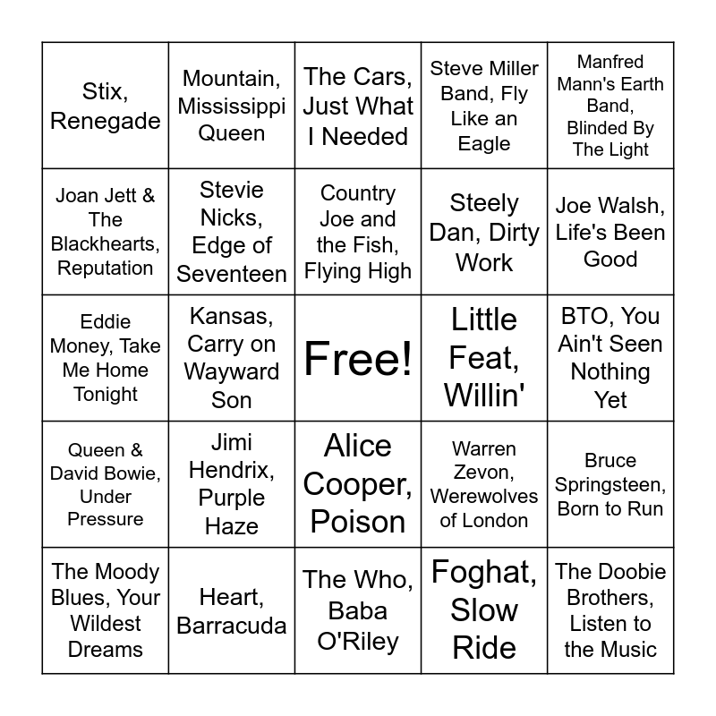 This bingo card has a free space and 86 words: .38 Special, Hold on Loosely, Aerosmith, Dream On, Alice Cooper, Poison, Asia, Heat of the Moment, Big Star, Thirteen, Billy Idol, Rebel Yell, Black Sabbath, Paranoid, Blondie, Call Me, Blue Oyster Cult, Burnin for You, Bob Seger, Old Time Rock and Roll, Bon Jovi, You Give Love a Bad Name, Boston, Peace of Mind, Bruce Springsteen, Born to Run, BTO, You Ain't Seen Nothing Yet, CCR, Fortunate Son, Country Joe and the Fish, Flying High, Cream, Sunshine of Your Love, David Bowie, Heroes, Deep Purple, Smoke on the Water, Def Leppard, Love Bites, Dire Straits, Sultans of Swing, Don Henley, The Boys of Summer, Eddie Money, Take Me Home Tonight, Fleetwood Mac, Gypsy, Foghat, Slow Ride, Foreigner, Jukebox Hero, Free, All Right Now, Grand Funk Railroad, Some Kind of Wonderful, Guns n Roses, Welcome to the Jungle, Harry Chapin, Cat's in the Cradle, Heart, Barracuda, Iggy Pop, The Passenger, Janis Joplin, Piece of my Heart, Jimi Hendrix, Purple Haze, Joan Jett & The Blackhearts, Reputation, Joe Jackson, Is She Really Going Out With Him, Joe Walsh, Life's Been Good, John Mellencamp, Jack and Diane, Journey, Any Way You Want It, Kansas, Carry on Wayward Son, KISS, Detroit Rock City, Led Zeppelin, Whole Lotta Love, Linda Ronstadt, It's So Easy, Little Feat, Willin', Lynyrd Skynyrd, Simple Man, Manfred Mann's Earth Band, Blinded By The Light, Metallica, Master of Puppets, Mountain, Mississippi Queen, Ozzy Osbourne, Mama I'm Coming Home, Pat Benatar, Heartbreaker, Patti Smith, Because the Night, Pink Floyd, Money, Queen & David Bowie, Under Pressure, Rolling Stones, Gimme Shelter, Roxy Music, More Than This, Rush, Limelight, Scorpions, Rock You Like a Hurricane, Steely Dan, Dirty Work, Steve Miller Band, Fly Like an Eagle, Stevie Nicks, Edge of Seventeen, Stix, Renegade, Supertramp, Girlfriend, Talking Heads, Psycho Killer, The Animals, House of the Rising Sun, The Bubble Puppy, Hot Smoke and Sasafrass, The Cars, Just What I Needed, The Clash, London Calling, The Doobie Brothers, Listen to the Music, The Doors, Touch Me, The Eagles, New Kid in Town, The Edgar Winter Group, Free Ride, The Kinks, Lola, The Moody Blues, Your Wildest Dreams, The Outfield, Your Love, The Police, King of Pain, The Rolling Stones, Gimme Shelter, The Who, Baba O'Riley, Thin Lizzy, Whiskey in the Jar, Tom Petty, Breakdown, Toto, Rosanna, Traffic, Dear Mr. Fantasy, Squeeze, Tempted, Van Halen, Runnin with the Devil, Warrant, Cherry Pie, Warren Zevon, Werewolves of London and ZZ Top, Sharp Dressed Man.
