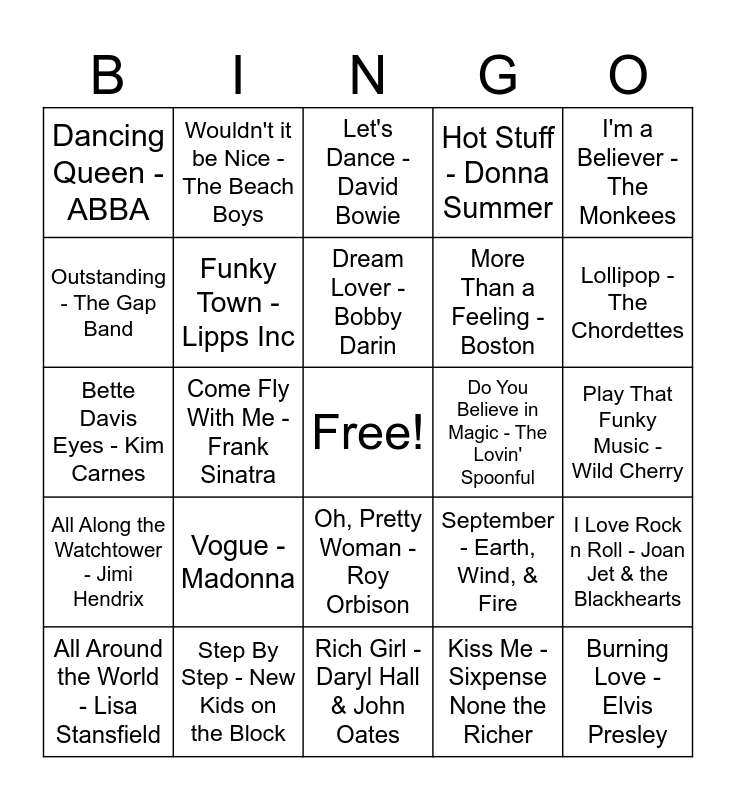 This bingo card has a free space and 54 words: My Girl - The Temptations, All Along the Watchtower - Jimi Hendrix, Respect - Aretha Franklin, Ring of Fire - Johnny Cash, Oh, Pretty Woman - Roy Orbison, How Deep is Your Love - Bee Gees, Hot Stuff - Donna Summer, Stand by Me - Otis Redding, Outstanding - The Gap Band, Let's Groove - Earth, Wind, & Fire, Dancing Queen - ABBA, Uptown Girl - Billy Joel, Step By Step - New Kids on the Block, All Around the World - Lisa Stansfield, Best of my Love - The Emotions, Rich Girl - Daryl Hall & John Oates, Burning Love - Elvis Presley, More Than a Feeling - Boston, Don't Stop Til You Get Enough - Michael Jackson, Play That Funky Music - Wild Cherry, September - Earth, Wind, & Fire, You Can't Hurry Love - The Supremes, Do You Believe in Magic - The Lovin' Spoonful, I'm a Believer - The Monkees, Born to Be Wild - Steppenwolf, Wouldn't it be Nice - The Beach Boys, Shout - The Isley Brothers, I Cant Help Myself - Four Tops, Come Together - The Beatles, Kiss Me - Sixpense None the Richer, Walking on Sunshine - Katrina & The Waves, Heaven is A Place on Earth - Belinda Carlisle, Should I Stay or Should I Go - The Clash, Tell it to My Heart - Taylor Dayne, Let's Dance - David Bowie, Kiss - Prince, Bette Davis Eyes - Kim Carnes, I Love Rock n Roll - Joan Jet & the Blackhearts, Holiday - Madonna, Funky Town - Lipps Inc, Sara Smile - Daryl Hall & John Oates, Reasons - Earth, wind, & Fire, Staying Alive - Bee Gees, Black Velvet - Alannah Myles, Vogue - Madonna, Beyond the Sea - Bobby Darin, Heartbreak Hotel - Elvis Presley, Little Bitty Pretty One - Thurston Harris, Dream Lover - Bobby Darin, Come Fly With Me - Frank Sinatra, Lollipop - The Chordettes, Rock Around the Clock - Billy Haley & His Comets, Only You - The Platters and Take Five - Dave Burbeck.