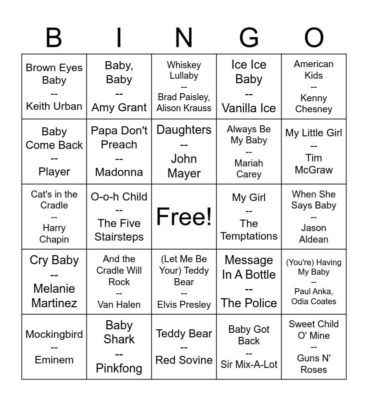 This bingo card has a free space and 61 words: Baby -- Justin Bieber, Ludacris, Baby Shark -- Pinkfong, ...Baby One More Time -- Britney Spears, Cry Baby -- Melanie Martinez, Baby Got Back -- Sir Mix-A-Lot, Baby Don't Hurt Me -- David Guetta, Papa Don't Preach -- Madonna, Baby Love -- The Supremes, Always Be My Baby -- Mariah Carey, Be My Baby -- The Ronettes, Ice Ice Baby -- Vanilla Ice, Baby I Need Your Loving -- Four Tops, Baby Come Back -- Player, Baby, I Love Your Way -- Big Mountain, Baby Boy -- Beyoncé, Sean Paul, Brown Eyes Baby -- Keith Urban, Sweet Child O' Mine -- Guns N' Roses, American Kids -- Kenny Chesney, Kids In America -- Kim Wilde, Daughters -- John Mayer, My Girl -- The Temptations, Whiskey Lullaby -- Brad Paisley, Alison Krauss, Mockingbird -- Eminem, (You're) Having My Baby -- Paul Anka, Odia Coates, There Goes My Life -- Kenny Chesney, There Goes My Baby -- The Drifters, When You Have A Child -- Reba McEntire, Small Bump -- Ed Sheeran, My Little Girl -- Tim McGraw, Baby Mine -- Alison Krauss, Two Pink Lines -- Eric Church, One's On The Way -- Loretta Lynn, Lullaby -- The Chicks, Let Them Be Little -- Lonestar, Baby, Baby -- Amy Grant, Hey Baby -- Pitbull, T-Pain, Ooh Baby Baby -- Linda Ronstadt, O-o-h Child -- The Five Stairsteps, Isn't She Lovely -- Stevie Wonder, Cat's in the Cradle -- Harry Chapin, Cradle Of Love -- Billy Idol, And the Cradle Will Rock -- Van Halen, When She Says Baby -- Jason Aldean, Genie In a Bottle -- Christina Aguilera, Message In A Bottle -- The Police, Missing My Baby -- Selena, Dust On The Bottle -- David Lee Murphy, Crack A Bottle -- Eminem, Shake, Rattle And Roll -- Bill Haley & His Comets, (Let Me Be Your) Teddy Bear -- Elvis Presley, Teddy Bear -- Red Sovine, Cryin' -- Aerosmith, Somebody's Baby -- Jackson Browne, Don't Worry Baby -- The Beach Boys, Give It To Me Baby -- Rick James, Be My Baby Tonight -- John Michael Montgomery, Love To Love You Baby -- Donna Summer, Kids -- MGMT, Hey! Baby -- Bruce Channel, Mammas, Don't Let Your Babies Grow Up To Be Cowboys -- Waylon Jennings, Willie Nelson and Watermelon Crawl -- Tracy Byrd.