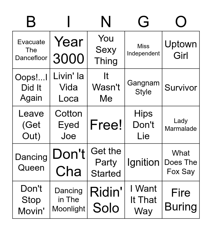 This bingo card has a free space and 34 words: Wannabe, I Want It That Way, Mambo No. 5, Wake Me Up Before You Go-Go, Dancing Queen, Livin' la Vida Loca, Uptown Girl, Don't Stop Movin', Year 3000, Grace Kelly, It Wasn't Me, You Sexy Thing, Stacy's Mom, All Star, Hips Don't Lie, Survivor, Dancing in The Moonlight, Leave (Get Out), Don't Cha, Ignition, Get the Party Started, Umbrella, Evacuate The Dancefloor, Lady Marmalade, Ridin' Solo, Fire Buring, Miss Independent, One Week, Gangnam Style, Oops!...I Did It Again, Shut Up And Drive, Cotton Eyed Joe, What Does The Fox Say and How Bizarre.