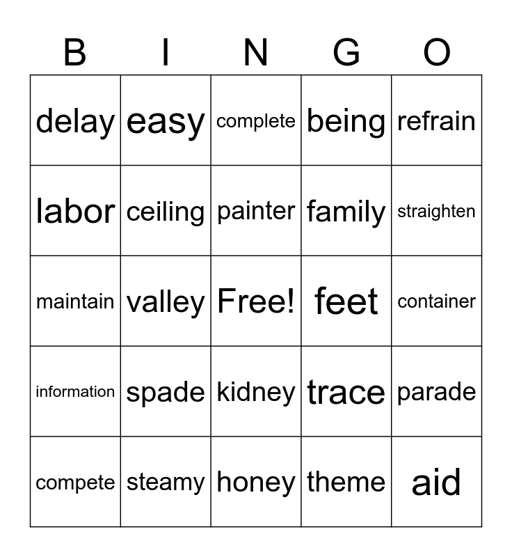 This bingo card has a free space and 50 words: tray, aid, shield, honey, spade, brief, easy, sweet, labor, city, ceiling, being, parade, trace, layer, slain, painter, feet, state, refrain, valley, theme, delay, family, grief, wheelbarrow, straighten, playground, complete, kidney, contemplate, receiver, fleeting, restrain, steamy, windshield, germinate, freedom, acquaint, container, eclipse, deceive, grievance, terminate, compete, maintain, volleyball, candidate, information and compete.
