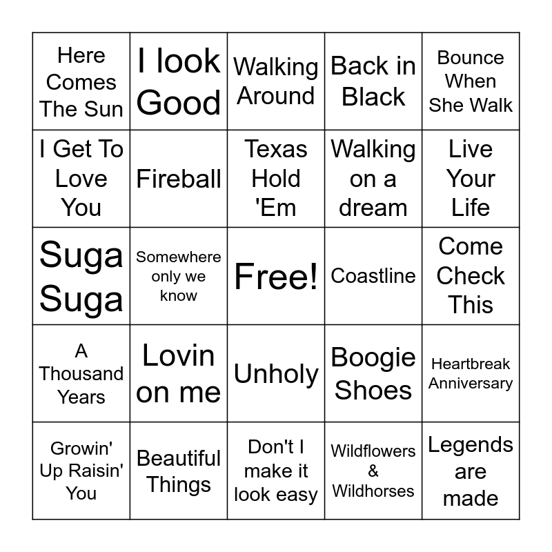 This bingo card has a free space and 38 words: Dreams, Lose Control, Lil Boo Thang, Fireball, Heartbreak Anniversary, Lovin on me, Texas Hold 'Em, Savage Love, Bounce When She Walk, Walking on a dream, Somewhere only we know, Back in Black, Legends are made, Come Check This, I Get To Love You, A Thousand Years, Good Times Go By Too Fast, Walking Around, Baby Doggie, Coastline, Here Comes The Sun, Beautiful Things, Live Your Life, Growin' Up Raisin' You, Coming In Hot, Don't I make it look easy, Made you look, Diamonds, Lovely Day, Unstoppable, Good Day, Unholy, Wildflowers & Wildhorses, I look Good, Funkytown, Boogie Shoes, Suga Suga and I'm Just A Kid.
