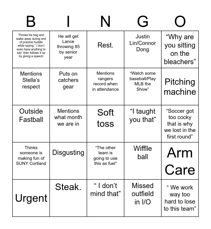 This bingo card has a free space and 24 words: Urgent, Disgusting, Mentions rangers record when in attendance, Missed outfield in I/O, “Why are you sitting on the bleachers”, Throws his bag and walks away during end of practice huddle while saying “ I don’t even have anything to say” then follows it up by giving a speech, He will get Lance throwing 85 by senior year, Rest., “I taught you that”, “Soccer got too cocky that is why we lost in the first round”, Outside Fastball, Puts on catchers gear, Wifflle ball, Arm Care, Mentions Stella’s respect, Steak., “ I don’t mind that”, Justin Lin/Connor Dong, Pitching machine, Thinks someone is making fun of SUNY Cortland, Mentions what month we are in, “The other team is going to use this as fuel”, “Watch some baseball/Play MLB the Show” and “ We work way too hard to lose to this team”.