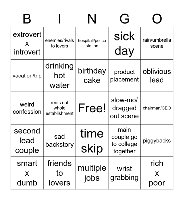 This bingo card has a free space and 45 words: FL trips into ML arms, rich x poor, love triangle, smart x dumb, accidental kiss, wrist grabbing, hospitall/police station, embarrassing drunk behavior, rain/umbrella scene, friends to lovers, sick day, slow-mo/ dragged out scene, time skip, sad backstory, random english, multiple jobs, someone guesses what happens, weird confession, make-over, oblivious lead, enemies/rivals to lovers, interrupted freaky moment, ML saves FL from creep, extrovert x introvert, bullied character, chairman/CEO, eyes locked for too long, flashback, main couple go to college together, second lead couple, pretending to sleep, piggybacks, arranged marriage, karaoke, princess carry, rents out whole establishment, drinking games, childhood friend shows up, tear wipe, birthday cake, vacation/trip, product placement, surprise hug, drinking hot water and reincarnation/re-brith.