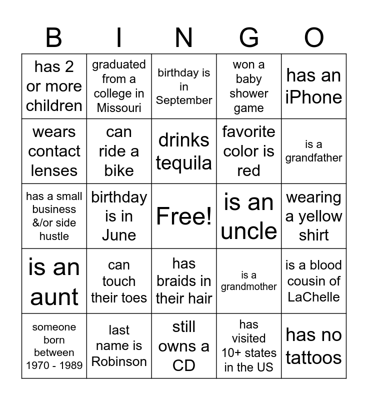 This bingo card has a free space and 69 words: wearing a white shirt, wearing a yellow shirt, wearing a red shirt, last name is Billups, last name is Robinson, brought a pack of diapers, won a baby shower game, has a photo of LaChelle in their phone, has an iPhone, has an Android phone, is a blood cousin of LaChelle, is a blood cousin of Chad, has 2 or more children, birthday is in September, birthday is in November, birthday is in June, has braids in their hair, favorite color is red, favorite color is yellow, is an aunt, is an uncle, is a grandmother, is a grandfather, has no children, not a native of St. Louis, MO, has been to a Cardinals baseball game this year, is a member of Zeta Phi Beta Sorority, Inc., is a member of Phi Beta Sigma Sorority, Inc., has visited 10+ states in the US, has been outside of the country, graduated from a college in Missouri, graduated from a college NOT in Missouri, played sports in high school, is the oldest or only child, wears glasses, is left handed, has the letter "e" in their name, has more 2 or more siblings, wears contact lenses, has gone fishing, can touch their toes, has no tattoos, has more than 2 tattoos, has a mustache or beard, someone born between 1950 - 1969, someone born between 1970 - 1989, someone born between 1990 - 2009, someone born 2010 & after, drinks coffee, can ride a bike, drinks tequila, drinks bourbon, does not drink coffee, still owns a CD, first name starts with "A, E, I, O, U, or Y", knows how to play an instrument, knows how to swim, has ridden on a horse, does their own hair, has a small business &/or side hustle, has been to 3 continents, has slept in a tent, gone to a concert this year, is not on Facebook, wearing New Balance tennis shoes, wearing Nike tennis shoes, wearing Jordan tennis shoes, wearing sandals/flip flops and has a dog.