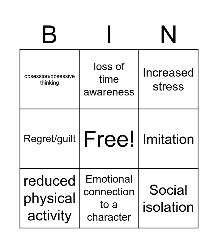 This bingo card has a free space and 11 words: sleep deprivation, Emotional connection to a character, Social isolation, reduced physical activity, loss of time awareness, Increased stress, Imitation, escapism, Regret/guilt, obsession/obsessive thinking and prioritize binging.