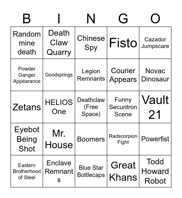 This bingo card has a free space and 24 words: Mr. House, Enclave Remnant s, Legion Remnants, Eastern Brotherhood of Steel, Cazador Jumpscare, Random mine death, Powder Ganger Appearance, Death Claw Quarry, Funny Securitron Scene, Boomers, Courier Appears, Zetans, Radscorpion Fight, Powerfist, Goodsprings, Great Khans, Vault 21, Chinese Spy, Novac Dinosaur, HELIOS One, Todd Howard Robot, Eyebot Being Shot, Fisto and Blue Star Bottlecaps.