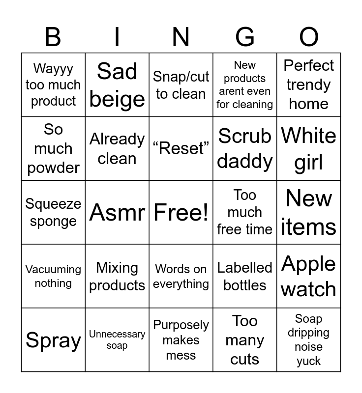 This bingo card has a free space and 24 words: Mixing products, Unnecessary soap, “Reset”, Spray, Perfect trendy home, Wayyy too much product, So much powder, Sad beige, Too much free time, Words on everything, Scrub daddy, Squeeze sponge, Labelled bottles, Apple watch, Already clean, Too many cuts, New items, Snap/cut to clean, White girl, Asmr, Soap dripping noise yuck, Vacuuming nothing, New products arent even for cleaning and Purposely makes mess.