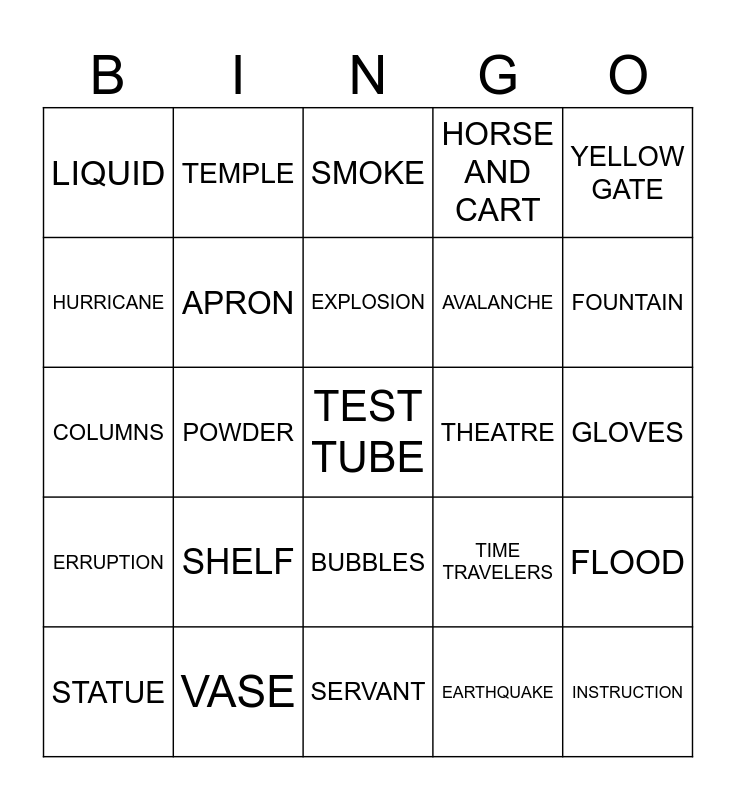 This bingo card has 28 words: FLOOD, VOLCANO, AVALANCHE, EARTHQUAKE, HURRICANE, SMOKE, TEMPLE, ERRUPTION, THEATRE, STATUE, COLUMNS, HORSE AND CART, VASE, SERVANT, FOUNTAIN, GOGGLES, SHELF, APRON, EXPLOSION, BUBBLES, LIQUID, INSTRUCTION, TEST TUBE, POWDER, GLOVES, TIME TRAVELERS, YELLOW GATE and EARTH'S PLATES.