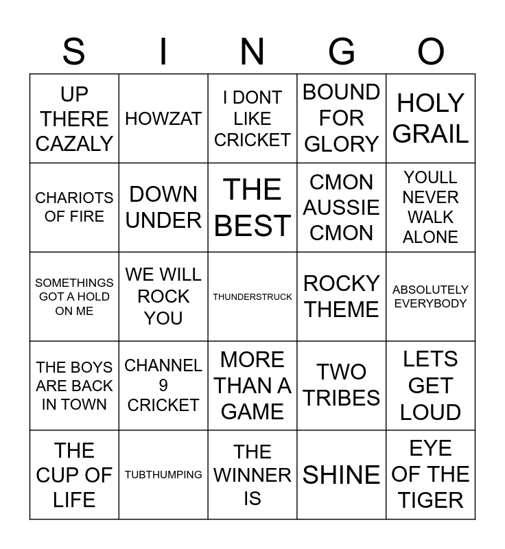 This bingo card has 25 words: CHANNEL 9 CRICKET, THE WINNER IS, THE BEST, THE CUP OF LIFE, HOLY GRAIL, UP THERE CAZALY, CHARIOTS OF FIRE, HOWZAT, ROCKY THEME, MORE THAN A GAME, CMON AUSSIE CMON, SOMETHINGS GOT A HOLD ON ME, TWO TRIBES, LETS GET LOUD, DOWN UNDER, EYE OF THE TIGER, ABSOLUTELY EVERYBODY, I DONT LIKE CRICKET, YOULL NEVER WALK ALONE, WE WILL ROCK YOU, THUNDERSTRUCK, TUBTHUMPING, THE BOYS ARE BACK IN TOWN, BOUND FOR GLORY and SHINE.
