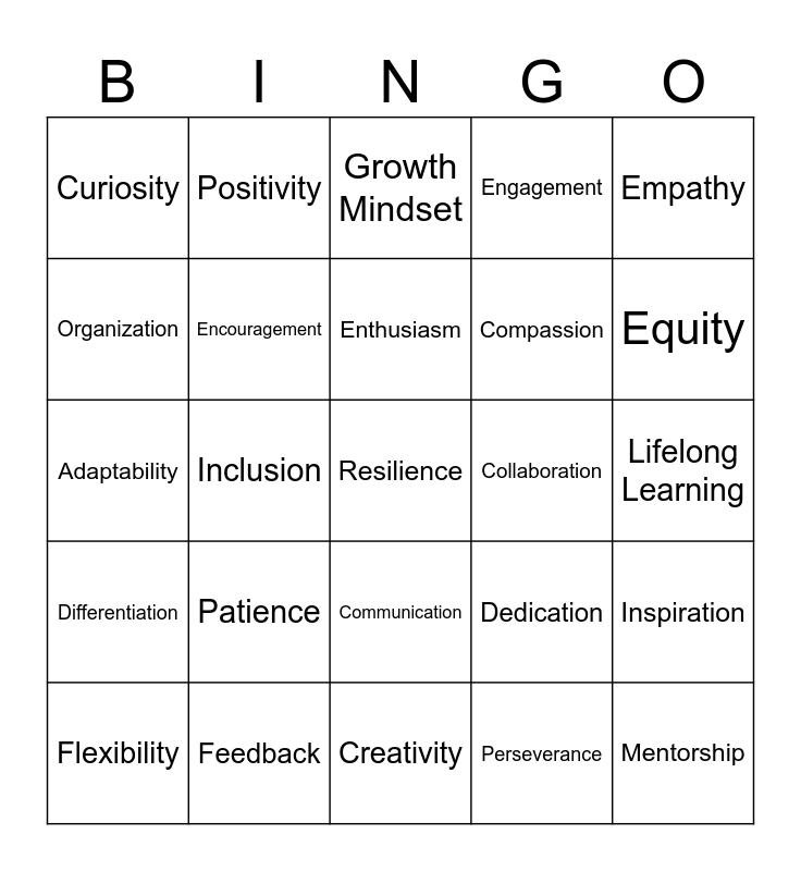 This bingo card has 25 words: Patience, Creativity, Enthusiasm, Flexibility, Empathy, Curiosity, Organization, Positivity, Collaboration, Communication, Compassion, Adaptability, Dedication, Inspiration, Encouragement, Mentorship, Lifelong Learning, Growth Mindset, Equity, Inclusion, Resilience, Feedback, Differentiation, Engagement and Perseverance.