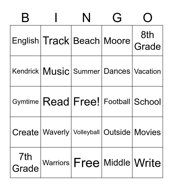 This bingo card has a free space and 24 words: Waverly, Warriors, Summer, 7th Grade, 8th Grade, English, Kendrick, Track, Football, Volleyball, Dances, Gymtime, Outside, Movies, Music, Middle, School, Beach, Vacation, Read, Write, Create, Moore and Free.
