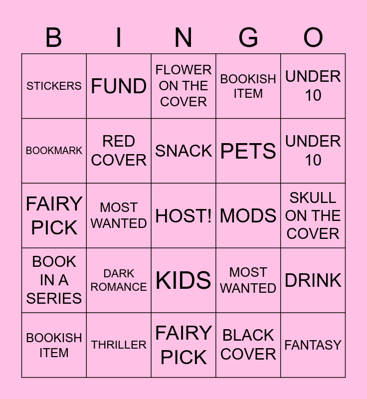 This bingo card has a free space and 24 words: DARK ROMANCE, THRILLER, SNACK, BOOKISH ITEM, UNDER 10, STICKERS, BOOKMARK, FUND, MODS, KIDS, PETS, FAIRY PICK, MOST WANTED, DRINK, RED COVER, BLACK COVER, SKULL ON THE COVER, FLOWER ON THE COVER, UNDER 10, MOST WANTED, FANTASY, BOOK IN A SERIES, BOOKISH ITEM and FAIRY PICK.