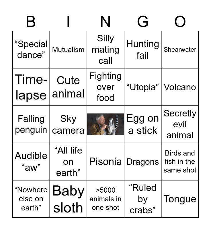 This bingo card has a free space and 24 words: “All life on earth”, Baby sloth, Fighting over food, “Nowhere else on earth”, Shearwater, “Special dance”, Time-lapse, Mutualism, Egg on a stick, Pisonia, “Utopia”, Falling penguin, Dragons, Birds and fish in the same shot, Cute animal, “Ruled by crabs”, Secretly evil animal, Silly mating call, Volcano, Sky camera, Tongue, Audible “aw”, Hunting fail and >5000 animals in one shot.
