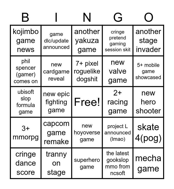 This bingo card has a free space and 24 words: capcom game remake, tranny on stage, 7+ pixel roguelike dogshit, cringe dance score, another stage invader, kojimbo game news, phil spencer (gamer) comes on, game dlc/update announced, 2+ racing game, new hoyoverse game, new valve game, ubisoft slop formula game, project L announced (lmao), skate 4(pog), new cardgame reveal, the latest gookslop mmo from ncsoft, new hero shooter, another yakuza game, 5+ mobile game showcased, new epic fighting game, mecha game, 3+ mmorpg, cringe pretend gaming session skit and superhero game.