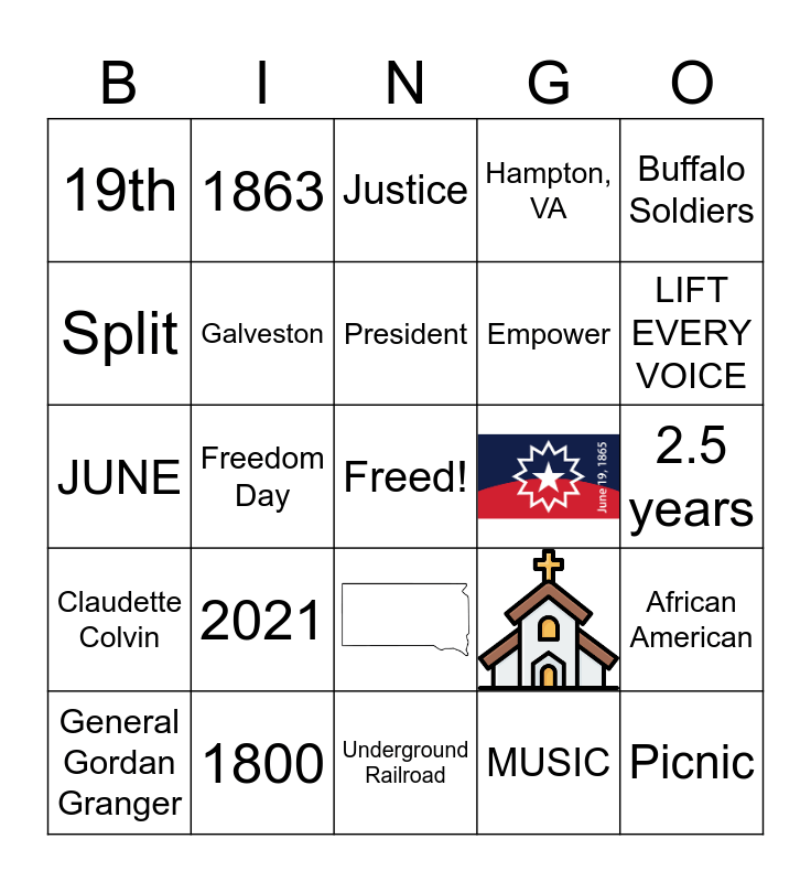 This bingo card has 3 images, a free space and 21 words: 2021, 1800, President, General Gordan Granger, Buffalo Soldiers, 19th, Split, 1863, Empower, JUNE, African American, Galveston, MUSIC, 2.5 years, Justice, LIFT EVERY VOICE, Freedom Day, Picnic, Claudette Colvin, Hampton, VA and Underground Railroad.