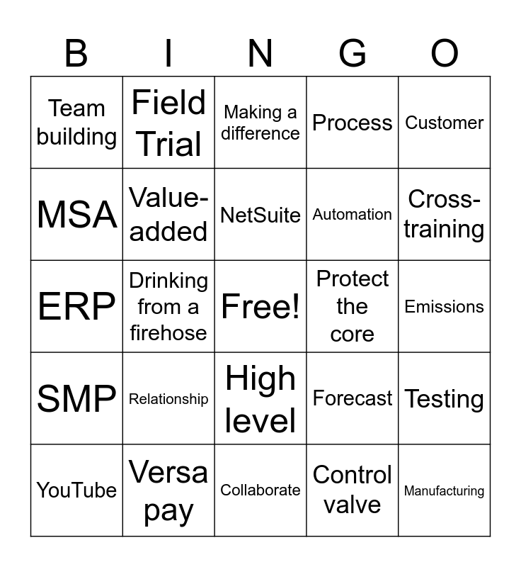 This bingo card has a free space and 32 words: Control valve, Repair, Drinking from a firehose, Product, SMP, Value-added, Customer, Testing, Field Trial, Non-core, NetSuite, Making a difference, Playbook, Pressure, Protect the core, Actuator, YouTube, ERP, High level, Relationship, Forecast, Customer experience, Emissions, Versa pay, Manufacturing, Process, Automation, MSA, Team building, Collaborate, Podcast and Cross-training.