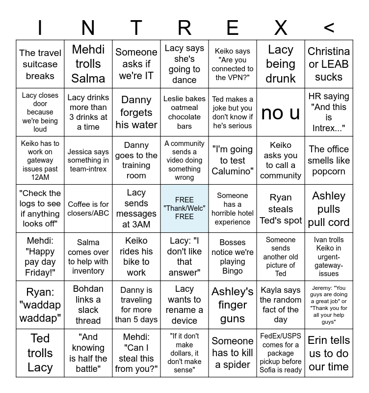 This bingo card has a free space and 48 words: Ashley's finger guns, no u, "If it don't make dollars, it don't make sense", Coffee is for closers/ABC, Danny goes to the training room, Ashley pulls pull cord, Mehdi trolls Salma, "And knowing is half the battle", Lacy being drunk, Lacy: "I don't like that answer", Christina or LEAB sucks, Lacy says she's going to dance, Keiko asks you to call a community, "I'm going to test Calumino", Ryan: "waddap waddap", Ryan steals Ted's spot, Lacy closes door because we're being loud, HR saying "And this is Intrex...", Kayla says the random fact of the day, Keiko says "Are you connected to the VPN?", Ted makes a joke but you don't know if he's serious, Lacy sends messages at 3AM, The travel suitcase breaks, Lacy drinks more than 3 drinks at a time, Jeremy: "You guys are doing a great job" or "Thank you for all your help guys", Danny forgets his water, The office smells like popcorn, Ted trolls Lacy, A community sends a video doing something wrong, Jessica says something in team-intrex, FedEx/USPS comes for a package pickup before Sofia is ready, Someone has a horrible hotel experience, Ivan trolls Keiko in urgent-gateway-issues, Bohdan links a slack thread, "Check the logs to see if anything looks off", Bosses notice we're playing Bingo, Someone sends another old picture of Ted, Keiko has to work on gateway issues past 12AM, Keiko rides his bike to work, Danny is traveling for more than 5 days, Mehdi: "Happy pay day Friday!", Erin tells us to do our time, Someone asks if we're IT, Mehdi: "Can I steal this from you?", Leslie bakes oatmeal chocolate bars, Lacy wants to rename a device, Salma comes over to help with inventory and Someone has to kill a spider.