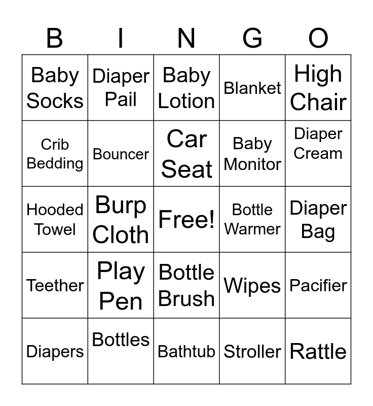 This bingo card has a free space and 24 words: Play Pen, Bottles, Car Seat, Diapers, High Chair, Baby Socks, Crib Bedding, Diaper Pail, Bottle Warmer, Bottle Brush, Baby Monitor, Hooded Towel, Wipes, Pacifier, Bouncer, Stroller, Diaper Bag, Baby Lotion, Diaper Cream, Burp Cloth, Rattle, Teether, Blanket and Bathtub.